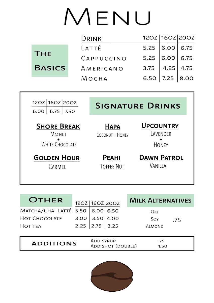 First Wave Coffee offers a straightforward and welcoming café menu centered around expertly crafted coffee and comforting drinks. The selection features familiar favorites like lattes, cappuccinos, and americanos alongside distinctive signature drinks such as the Golden Hour and Shore Break.